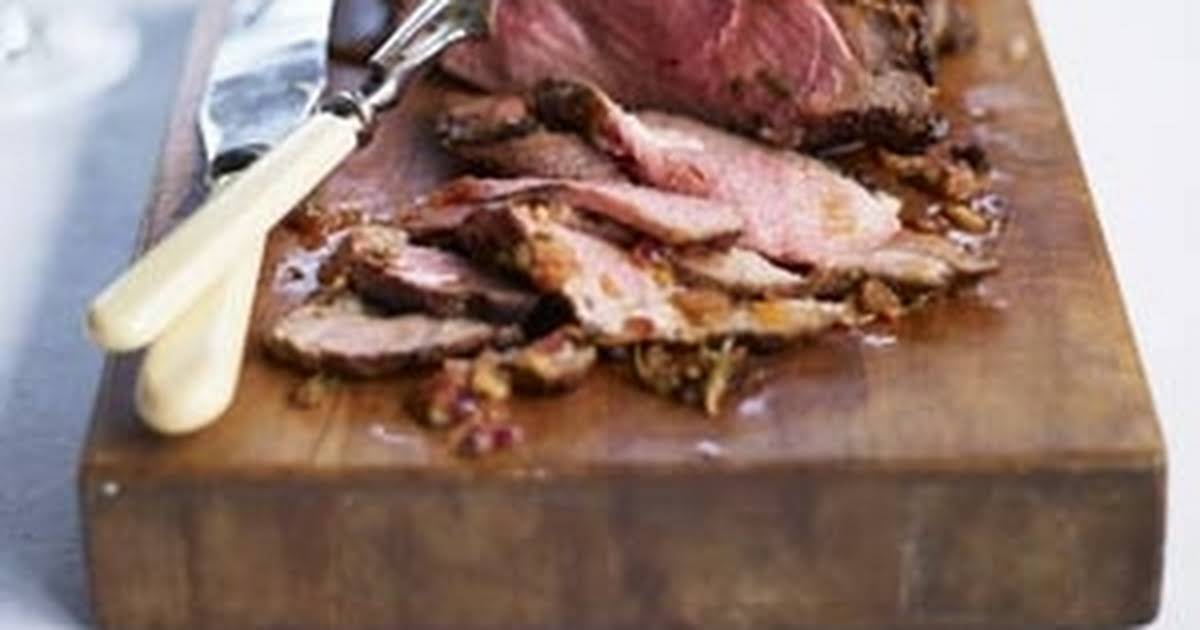 In this recipe the lamb is first butterflied, and smeared with an herby paste, and then rolled back up and tied.